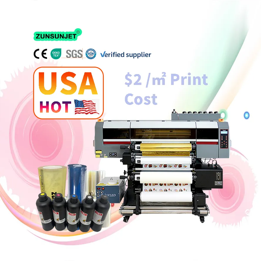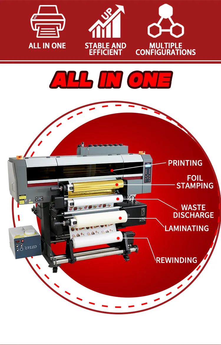 zunsun 2 in 1 UV Sticker DTF printer A1 takes printing technology to a new height, which is the first one to integrate the laminating process into the printing process. Shapes, sizes and uneven surfaces are no longer limitations of printing in front of this product.