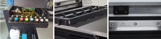 3 PIECES PRINT HEADS Efficient for Color ink, White and Varnish Printing output at one time, Automatic ink suction and cleaning system.