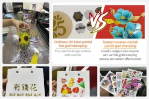 2. Capable of printing AB film stickers, double-sided color and white stickers, gold foil stickers, partial gold foil stickers, and more.