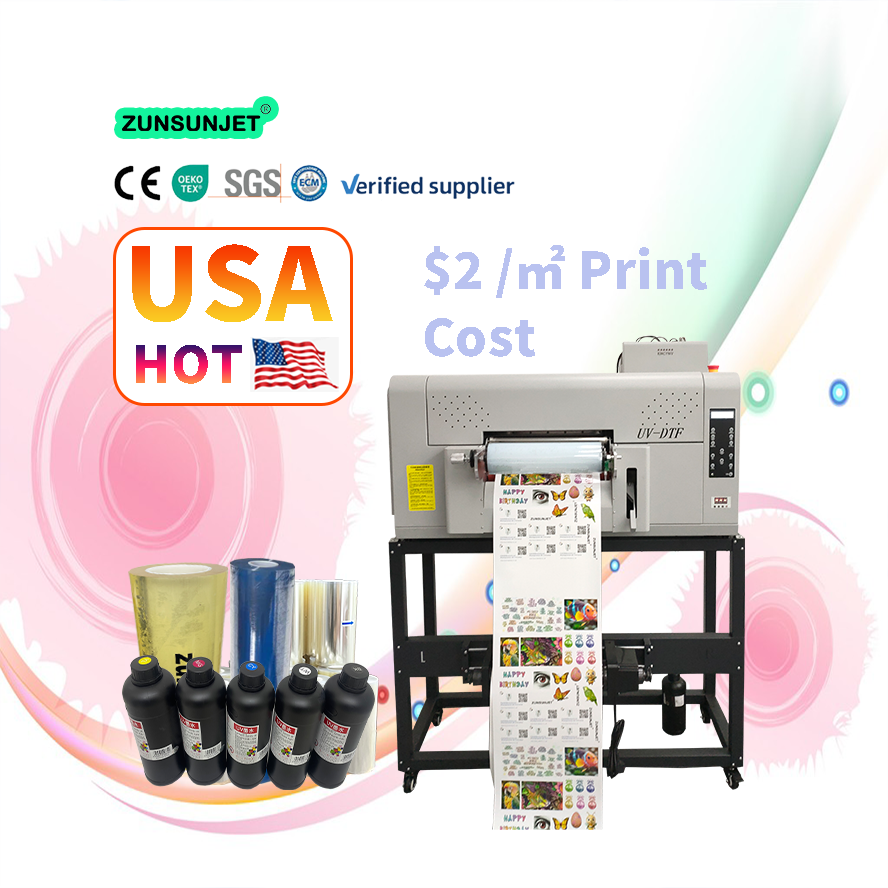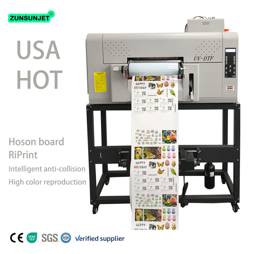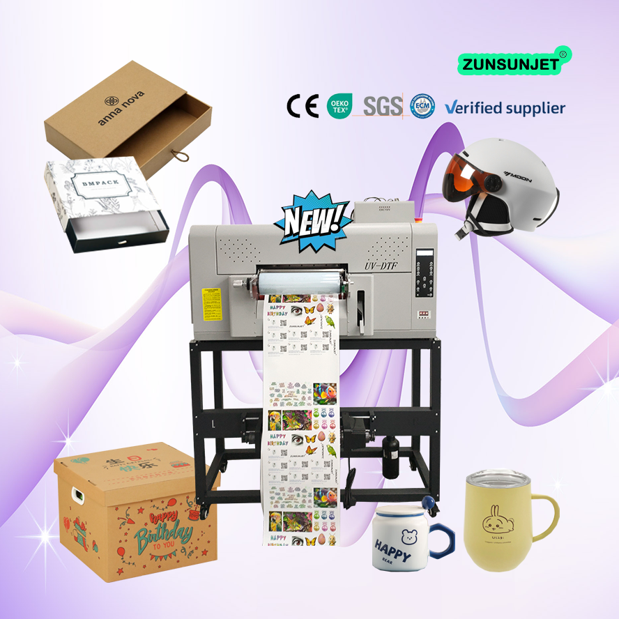 zunsun 2 in 1 UV Sticker DTF printer A3 takes printing technology to a new height, which is the first one to integrate the laminating process into the printing process. Shapes, sizes and uneven surfaces are no longer limitations of printing in front of this product.
