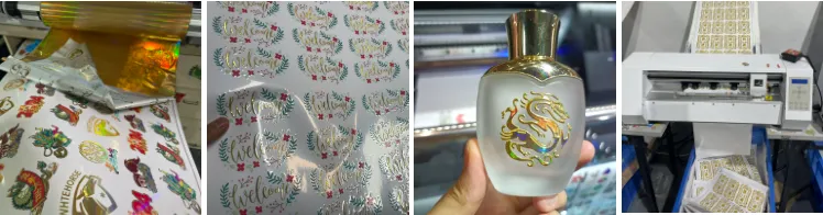 First print the pattern on the film, then machine powder and bake it, later cut the printed pattern, finally press it on the garment with a heat press machine
