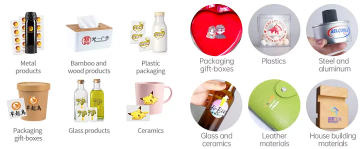 2. most material: plastic, glass, ceramics, paper, paperboard, metal, leather and so on.such as pen, notebook, phone case, mouse, vase, bottle, can, mug, packing box, purse, pad, USB flash disk, electric appliance.