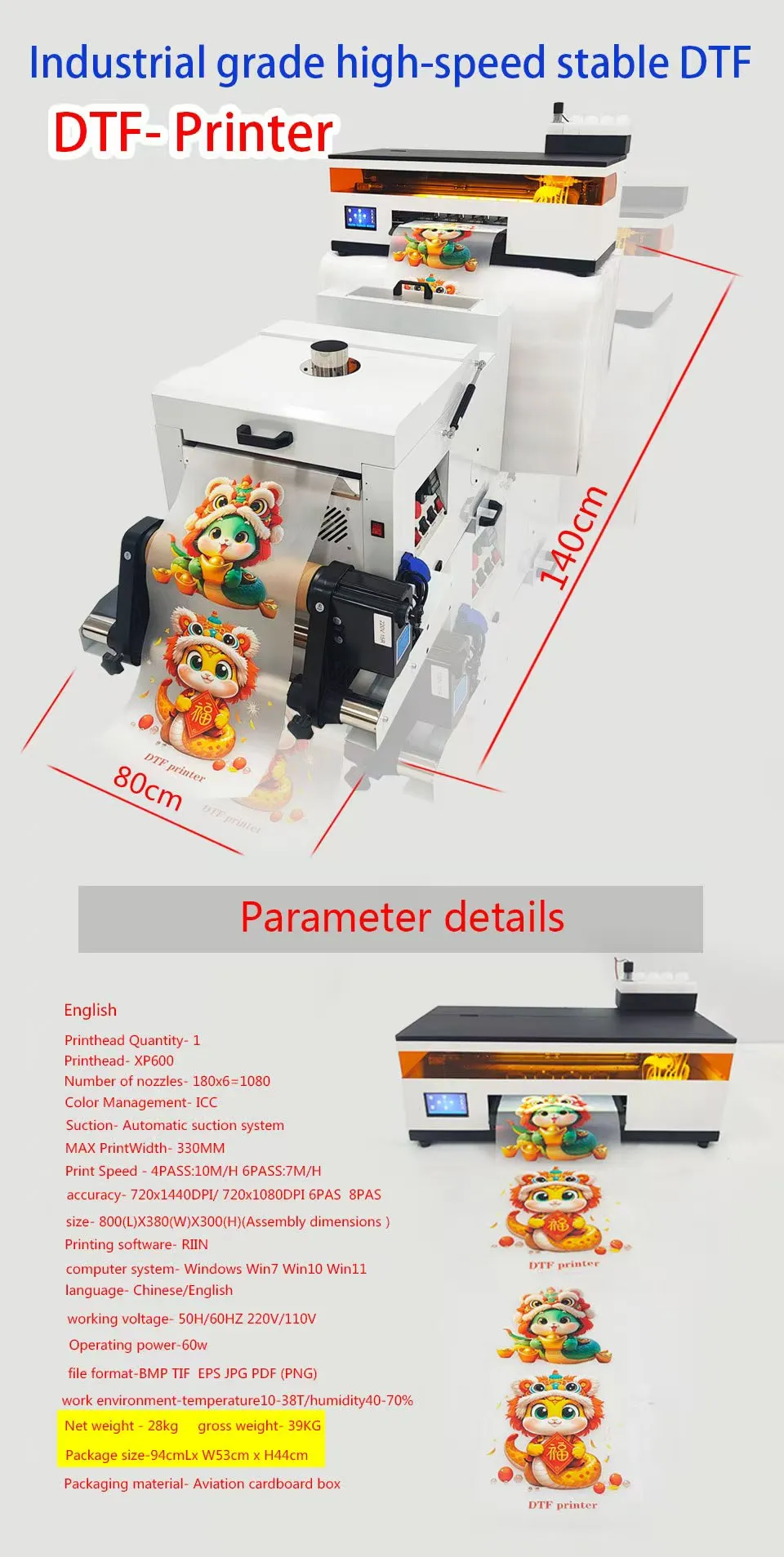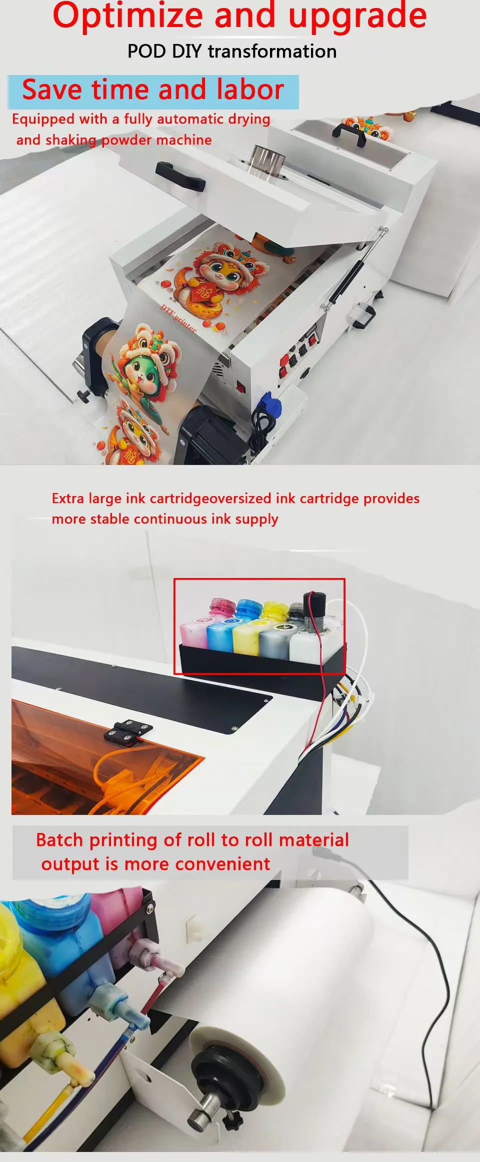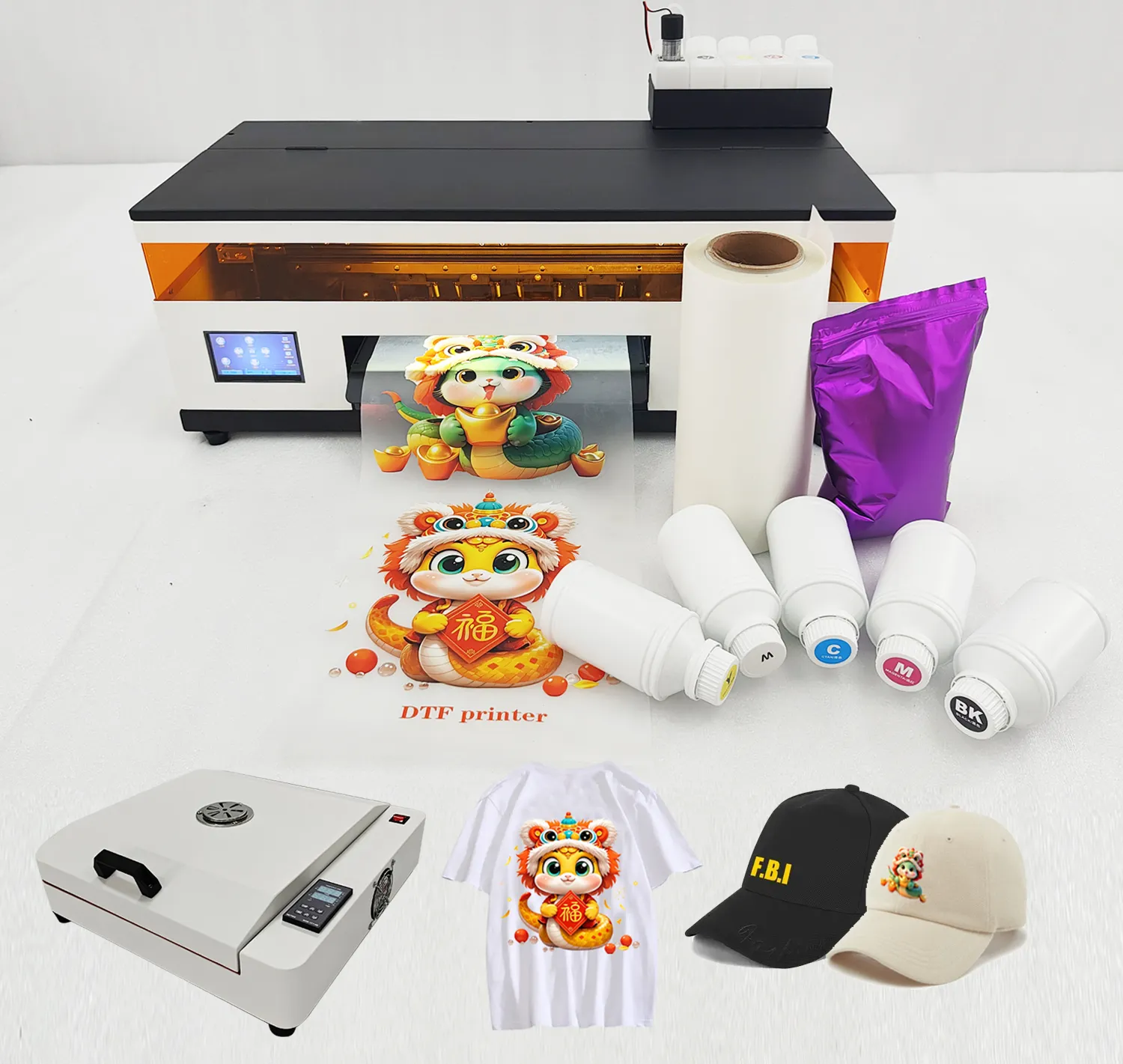 A: Our printer does not come with ink, if you need to buy with the ink together, please contact us. We also provide the spare parts, and printing materials, such as PET film, dtf powder, etc. If you need, please contact us.
